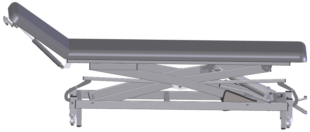 - Fußhebel beidseits auf der Längsseite der Liege angebracht