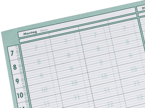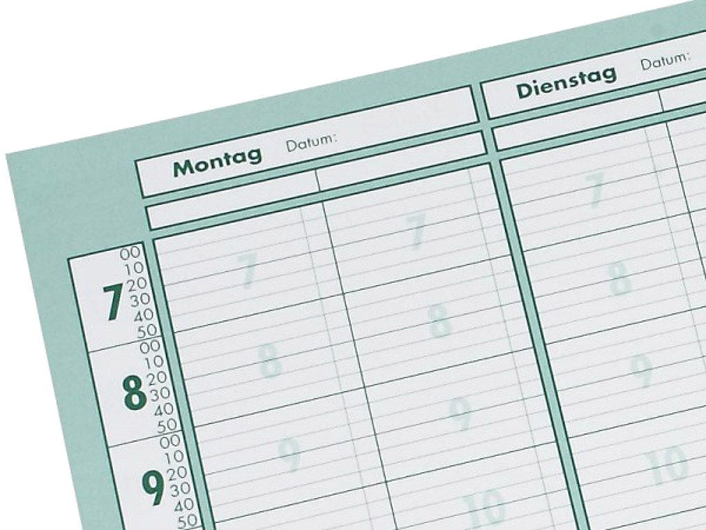 Dieser Terminplaner im 10-Minuten Takt bleibt auch bei unterschiedlichen Zeittakten übersichtlich. Auf einen Blick sind sowohl der 20-, 30-, 40-Minuten Takt, als auch der 50- oder 60-Minuten Takt planbar.